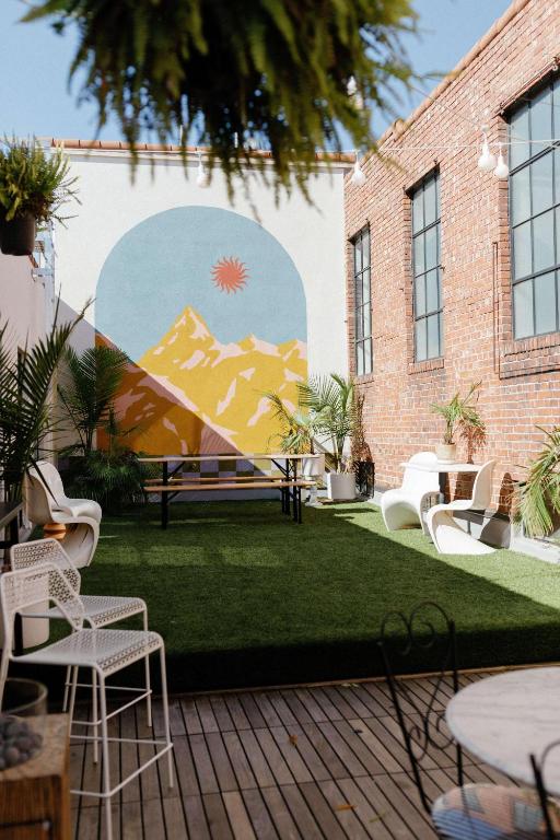 Aucune chambre ne se ressemble : chacune est conçue dans un style bohème chic et baignée de lumière naturelle. Les intérieurs mettent en valeur des murs en briques apparentes, des plafonds aux poutres apparentes, de grandes fenêtres ornées de rideaux légers et des plantes en pot, mêlant des pièces du milieu du siècle dernier à un mobilier ludique comme des boules disco, des tabourets en bambou et des fauteuils suspendus en osier.
