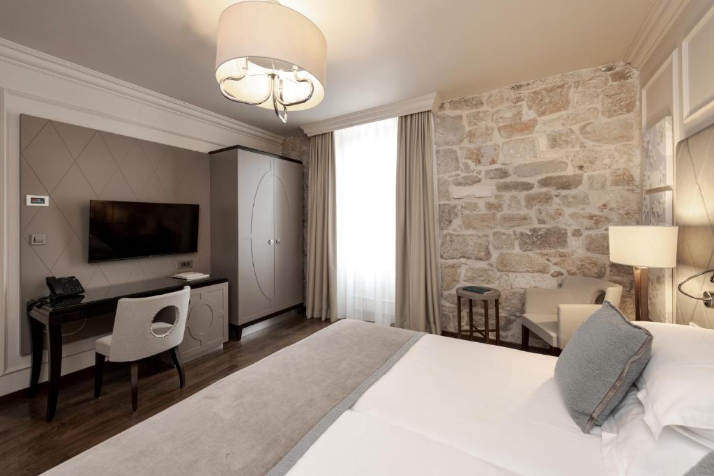 Ce refuge de charme dispose de 27 chambres et suites aux tons apaisants de gris et de blanc, rehaussées par un mobilier artisanal et des parquets en teck. Les clients peuvent profiter d'un confort moderne et dîner au Kaštel, où la cuisine méditerranéenne et locale est mise à l'honneur, en particulier sur la terrasse offrant une vue panoramique.