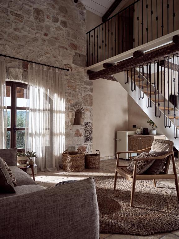 Les villas allient un design traditionnel au confort moderne, avec des sols en terre cuite, des plafonds voûtés et des têtes de lit tissées à la main. La cuisine familiale fait désormais office de restaurant, où le chef Giannis Remos prépare des plats grecs classiques, perpétuant ainsi la tradition familiale des Giatria, vieille de plusieurs générations, qui consiste à partager des repas dans une ambiance chaleureuse et familiale.